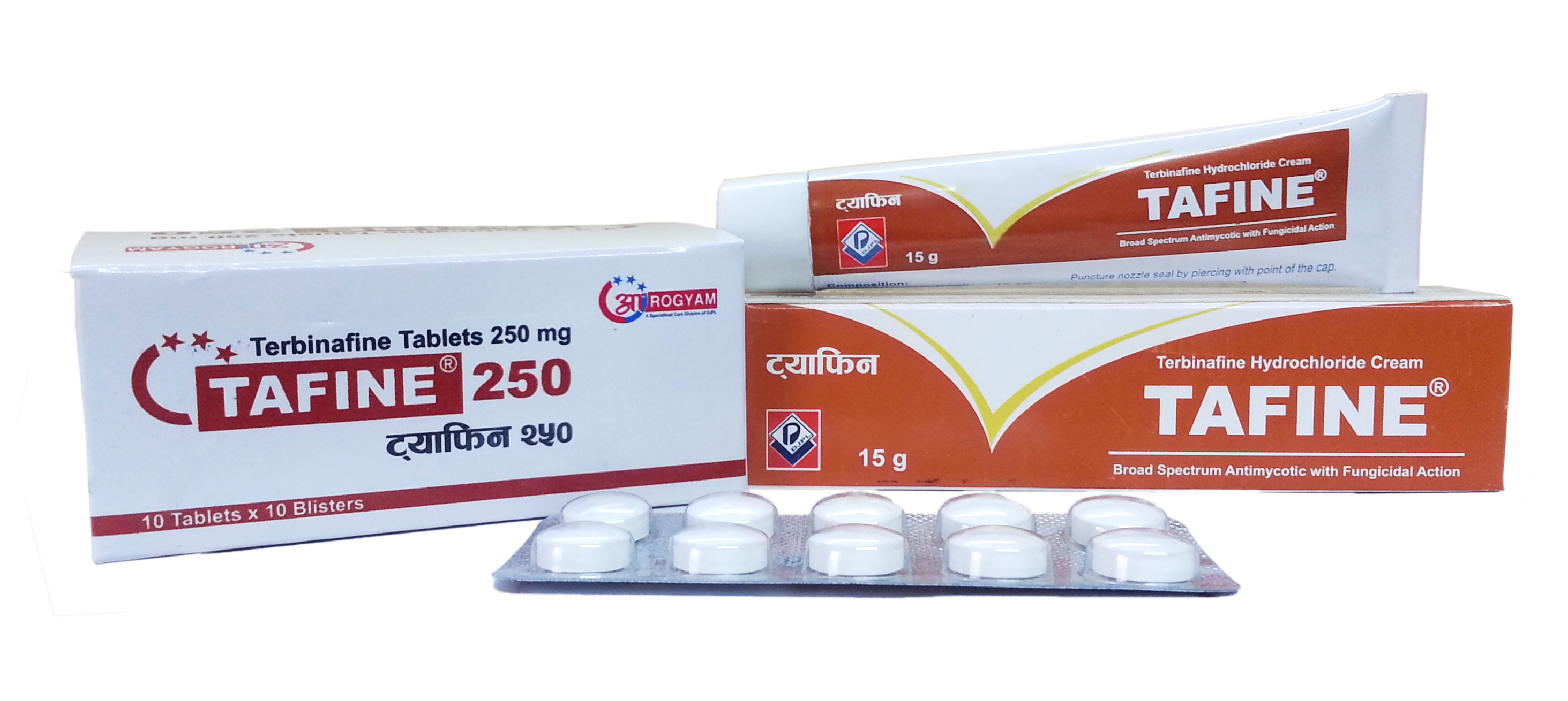 Oral Tafine® is indicated in the treatment of ringworm (tinea corporis, tinea cruris, tinea pedis and tinea capitis) and yeast infections of the skin caused by the genus Candida (e.g. Candida albicans) where oral therapy is considered appropriate owing to the site, severity or extent of the infection, Onychomycosis (fungal infection of the nail) caused by dermatophyte fungi.